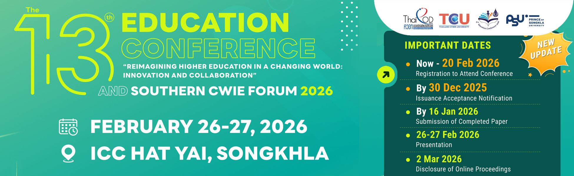 ประชุมวิชาการทางการศึกษาระดับชาติ ครั้งที่ ๑๓ The 13th Education Conference “Reimagining Higher Education in a Changing World: Innovation and Collaboration” และ Southern CWIE Forum 2026