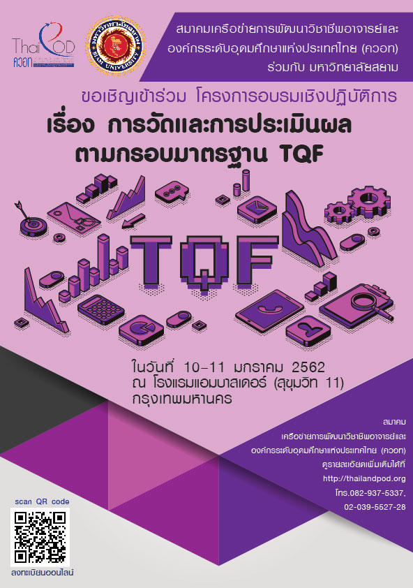 เพื่อเป็นการส่งเสริมสถาบันอุดมศึกษาให้สามารถดาเนินการตามกรอบมาตรฐานคุณวุฒิระดับอุดมศึกษาแห่งชาติได้อย่างมีประสิทธิภาพ สมาคมเครือข่ายการพัฒนาวิชาชีพอาจารย์และองค์กรระดับอุดมศึกษาแห่งประเทศไทย (ควอท) จึงร่วมกับมหาวิทยาลัยสยาม จัดโครงการอบรมเชิงปฏิบัติการเรื่อง การวัดและการประเมินผลตามกรอบมาตรฐาน TQF ขึ้น เพื่อเปิดโอกาสให้คณาจารย์ระดับอุดมศึกษาได้แลกเปลี่ยนเรียนรู้ และนาไปใช้กับการเรียนการสอนในรายวิชาและหลักสูตรให้เกิดผลสัมฤทธิ์ต่อไป