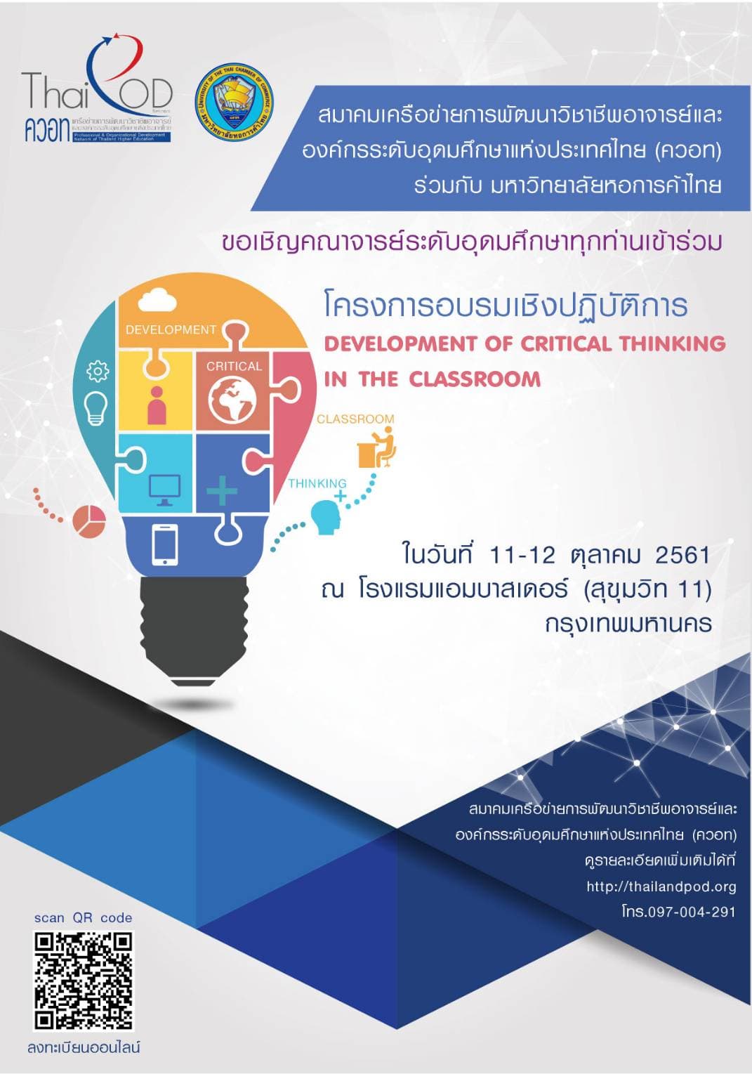 สมาคมเครือข่ายพัฒนาอาชีพอาจารย์และองค์กรระดับอุดมศึกษาแห่งประเทศไทย (ควอท) จึงร่วมกับมหาวิทยาลัยหอการค้าไทย จัดโครงการอบรมเชิงปฏิบัติการ Development of Critical Thinking in the Classroom เพื่อสนับสนุนให้ผู้สอนเข้าใจหลักการ รู้จักเครื่องมือที่สามารถนำไปใช้พัฒนาทักษะ critical thinking และ สามารถออกแบบกระบวนการสอนที่เหมาะสมแก่วิชา ผู้เรียน และสถาบันการศึกษาของตนได้อย่างมีประสิทธิภาพ