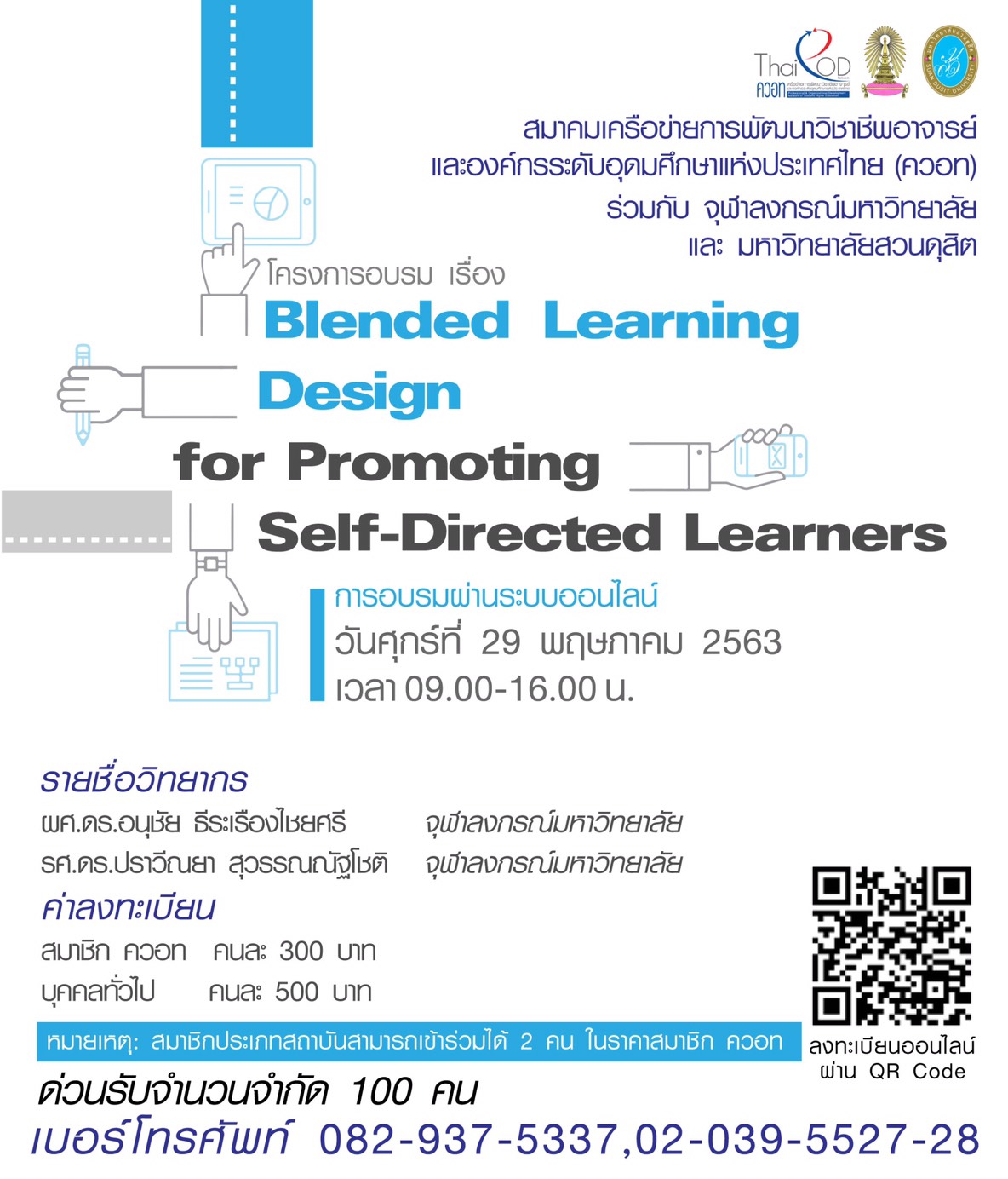 ดังนั้น สมาคมเครือข่ายการพัฒนาวิชาชีพอาจารย์และองค์กรระดับอุดมศึกษาแห่งประเทศไทย (ควอท) ร่วมกับ จุฬาลงกรณ์มหาวิทยาลัย และมหาวิทยาลัยสวนดุสิต กำหนดจัดกิจกรรมอบรมการสอนแบบออนไลน์ Blended Learning Design for Promoting Self-Directed Learners เพื่อให้ผู้สอนปรับกระบวนการสอนที่เน้น Effective Teaching มีความสามารถในการจัดการเรียนการสอนให้มีความเป็นพลวัตรที่มีผู้เรียนเป็นศูนย์กลาง การจัดการเรียนการสอนในรูปแบบดังกล่าวจะมิได้ลดเนื้อหาความรู้ให้น้อยลง แต่ผู้สอนจะต้องทำการวิเคราะห์เนื้อหาและปรับวิธีการสอนให้มีความเหมาะสมยิ่งขึ้น ด้วยการนำศักยภาพของเทคโนโลยีสารสนเทศมาใช้เป็นตัวกระตุ้นในการจัดการเรียนการสอนในฐานะที่เป็น Technology-driven Learning ซึ่งผู้เรียนสามารถศึกษาด้วยตนเองได้อย่างสะดวกทุกที่ ทุกเวลา (Anywhere, Anytime) เป็นการผสมผสานระหว่างการเรียนในห้องเรียนและการเรียนออนไลน์ (Blended Learning) เป็นการสร้างความเข้าใจเกี่ยวกับการจัดการเรียนการสอนออนไลน์ (Online Leaning) และการเรียนการสอนแบบผสมผสาน (Blended Learning) ให้แก่ผู้สอน เป็นสิ่งสำคัญที่จะทำให้ผู้สอนสามารถออกแบบกระบวนการจัดการเรียนการสอนให้เกิดสัมฤทธิผล และมีประสิทธิภาพยิ่งขึ้น และเป็นการส่งเสริมการเรียนรู้แนวทางการจัดการอุดมศึกษาในสภาวการณ์ปัจจุบัน ทั้งนี้สามารถเข้าร่วมการอบรมผ่านทาง Video Conference ในวันและเวลาที่กำหนด โดยใช้คอมพิวเตอร์ แท็บเล็ต หรือสมาร์ทโฟนของท่านได้ทุกที่ทุกเวลา ทั้งยังสามารถดูย้อนหลังเพื่อทบทวนเนื้อหาการเรียนที่ผ่านมาได้