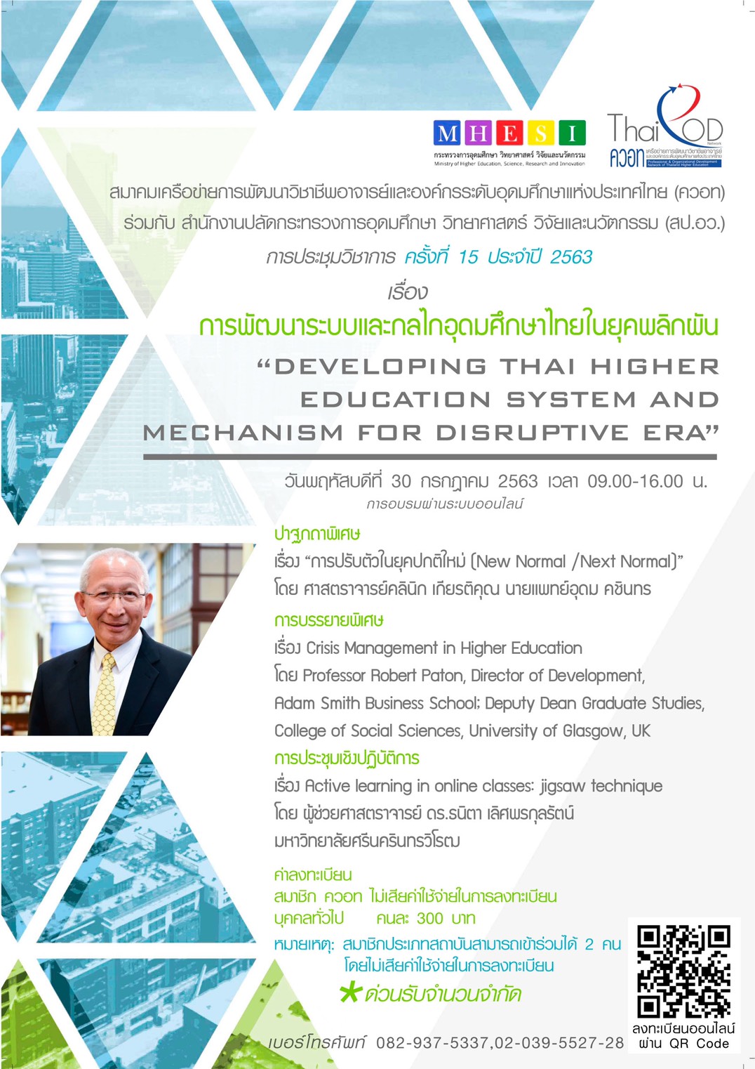 สมาคมฯ มีภารกิจในการจัดการประชุมวิชาการเป็นประจำทุกปี เพื่อการแลกเปลี่ยนเรียนรู้ระหว่างสถาบันอุดมศึกษาทั่วประเทศ ทั้งในด้านนวัตกรรมการเรียนรู้ แนวคิดและแนวปฏิบัติที่เป็นแบบอย่างที่ดี ตลอดจนการนำเสนอการวิจัยต่าง ๆ เกี่ยวกับการพัฒนาการเรียนการสอนระดับอุดมศึกษามาอย่างต่อเนื่อง เป็นปีที่ 15 ในการประชุมวิชาการประจำปี 2563 สำนักงานปลัดกระทรวงการอุดมศึกษา วิทยาศาสตร์ วิจัยและนวัตกรรม ได้ให้การสนับสนุนสมาคมฯ จัดการประชุมวิชาการประจำปีในหัวข้อ การพัฒนาระบบและกลไกอุดมศึกษาไทย ในยุคพลิกผัน “Developing Thai Higher Education System and Mechanism for Disruptive Era” ขึ้น เพื่อสร้างความตระหนักในกับผู้บริหาร อาจารย์ และบุคลากรของสถาบันอุดมศึกษา ร่วมกันพัฒนาระบบและกลไก ในการปรับตัวและรับมือกับยุคพลิกผันที่เกิดขึ้น เพื่อเรียนรู้และพัฒนาให้ก้าวข้ามภาวะวิกฤตดังกล่าวไปได้ โดยคำนึงถึงผู้เรียนและบุคลากรเป็นสำคัญ ในการประชุมวิชาการในครั้งนี้ ประกอบด้วย การนำเสนอบทความวิจัย บทความวิชาการเกี่ยวกับการจัดการเรียนการสอน ในยุคพลิกผัน การส่งเสริมการเรียนรู้และเปิดโอกาสให้ผู้บริหารและอาจารย์ในมหาวิทยาลัยเหล่านี้ ได้มาแลกเปลี่ยนเรียนรู้และถ่ายทอดองค์ความรู้ตลอดจนประสบการณ์ใน การจัดการกระบวนการเรียนการสอน ที่มุ่งเน้นการเรียนรู้ จากการปฏิบัติจริงกับคณาจารย์ระดับอุดมศึกษาหลากหลายสถาบันทั่วประเทศที่เข้าร่วมประชุมในครั้งนี้ มอบหมายให้สมาคมเครือข่ายการพัฒนาวิชาชีพอาจารย์และองค์กรระดับอุดมศึกษาแห่งประเทศไทย (ควอท) ดำเนินการจัดประชุมวิชาการประจำปีของสมาคมดังกล่าว จะเป็นหนทางสำคัญที่รองรับการขับเคลื่อนการสร้างเครือข่ายระหว่างสถาบันอุดมศึกษาในการพัฒนาการจัดการเรียน การสอน รวมทั้งการพัฒนาองค์กรให้ปฏิบัติหน้าที่ได้อย่างมีคุณภาพ ซึ่งจะนำไปสู่ความตระหนักรู้ในความสำคัญของเรื่องนี้ จนเกิดการสร้างหน่วยงานรองรับหน้าที่การพัฒนาดังกล่าวในแต่ละสถาบันของตนเองได้เป็นอย่างดีในอนาคต