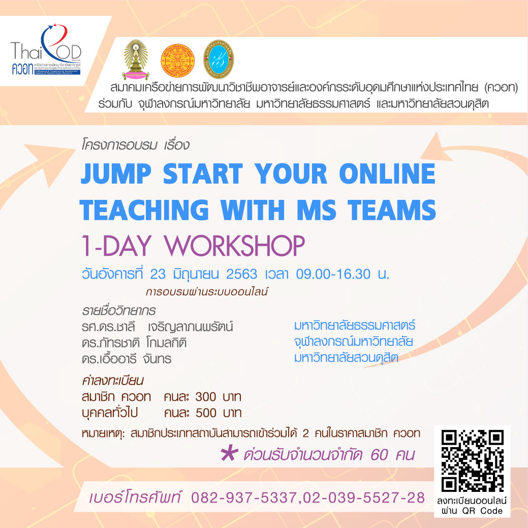 ดังนั้น สมาคมเครือข่ายการพัฒนาวิชาชีพอาจารย์และองค์กรระดับอุดมศึกษาแห่งประเทศไทย (ควอท) ซึ่งมีบทบาทให้การส่งเสริม สนับสนุนอาจารย์ให้สามารถจัดการเรียนการสอนให้มีประสิทธิภาพ จึงพิจารณาสนับสนุนองค์ความรู้ เทคนิค และทักษะการจัดการเรียนการสอนออนไลน์ แบบ Live สด ผ่านเครื่องมือเทคโนโลยี ที่หลากหลาย โดยการอบรมครั้งนี้ สมาคมฯ ขอเรียนเชิญคณาจารย์และผู้ที่สนใจร่วมเรียนรู้การจัดการห้องเรียนเสมือน (Virtual Classroom) ด้วย Microsoft Teams ซึ่งเป็นเครื่องมือที่สะดวกสำหรับอาจารย์และผู้เรียน สามารถเข้าถึงได้ง่าย และไม่มีข้อจำกัดเรื่องเวลา รวมถึงสามารถใช้งานร่วมกับ Microsoft stream ,YouTube, Hotmail, OneDrive, Outlook ได้เป็นอย่างดี ทั้งนี้ท่านสามารถเข้าร่วมการอบรมออนไลน์ผ่านทางแพลตฟอร์มในวันและเวลาที่กำหนด โดยใช้คอมพิวเตอร์ แท็บเล็ต หรือสมาร์ทโฟนของท่านได้ทุกที่ทุกเวลา ทั้งยังสามารถดูย้อนหลังเพื่อทบทวนเนื้อหาการเรียนที่ผ่านมาได้