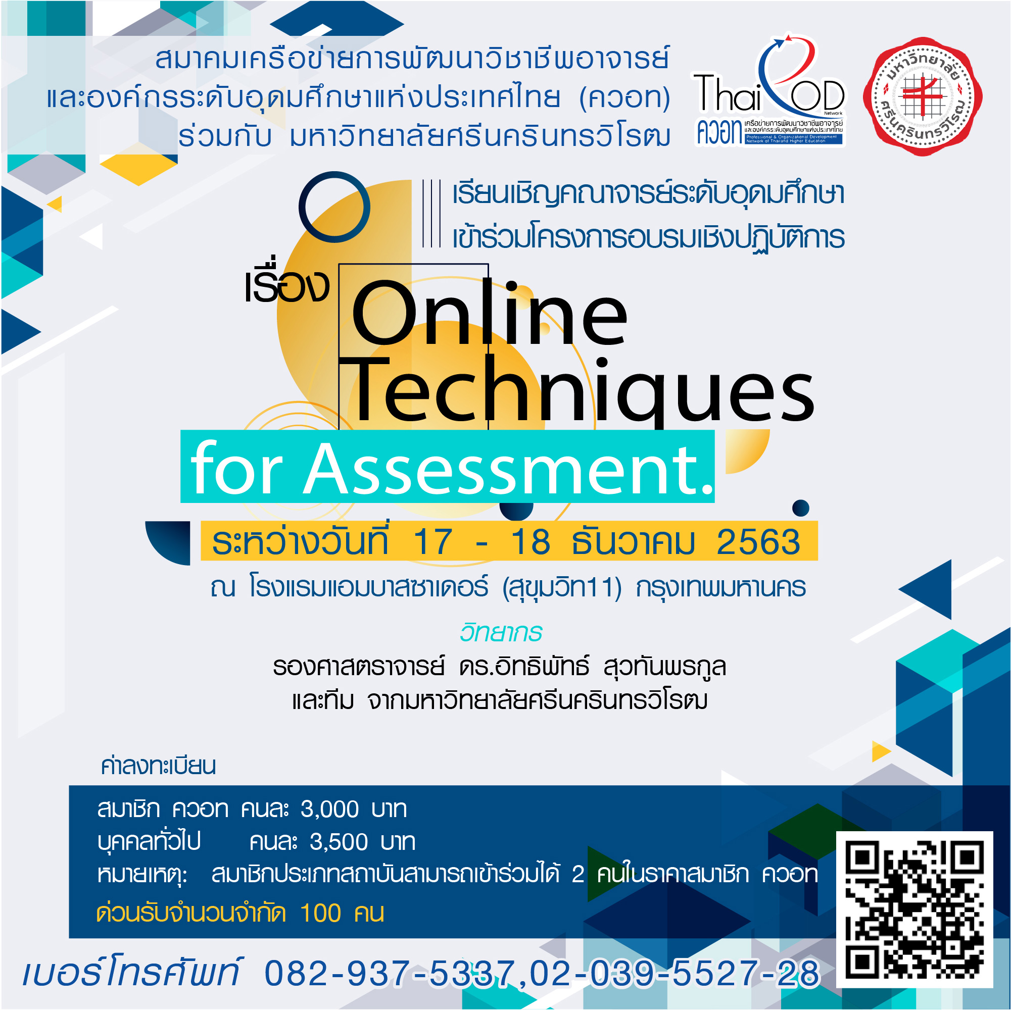 ดังนั้นสมาคมเครือข่ายการพัฒนาวิชาชีพอาจารย์และองค์กรระดับอุดมศึกษาแห่งประเทศไทย (ควอท) ได้ตระหนักและเห็นความสำคัญในด้านการอบรมให้ความรู้อาจารย์เกี่ยวกับการออกแบบการเรียนรู้และการประเมินผลการเรียนรู้ของผู้เรียนในรูปแบบออนไลน์ จึงได้ร่วมมือกับ มหาวิทยาลัยศรีนครินทรวิโรฒ ในการจัดโครงการอบรมเพื่อให้อาจารย์มีความรู้ ความเข้าใจ และสามารถออกแบบการเรียนรู้และการประเมินผลการเรียนรู้ของผู้เรียนในรูปแบบออนไลน์ได้อย่างถูกต้อง ซึ่งจะเป็นประโยชน์กับผู้สอนในการนำไปประยุกต์ใช้ได้ต่อไป