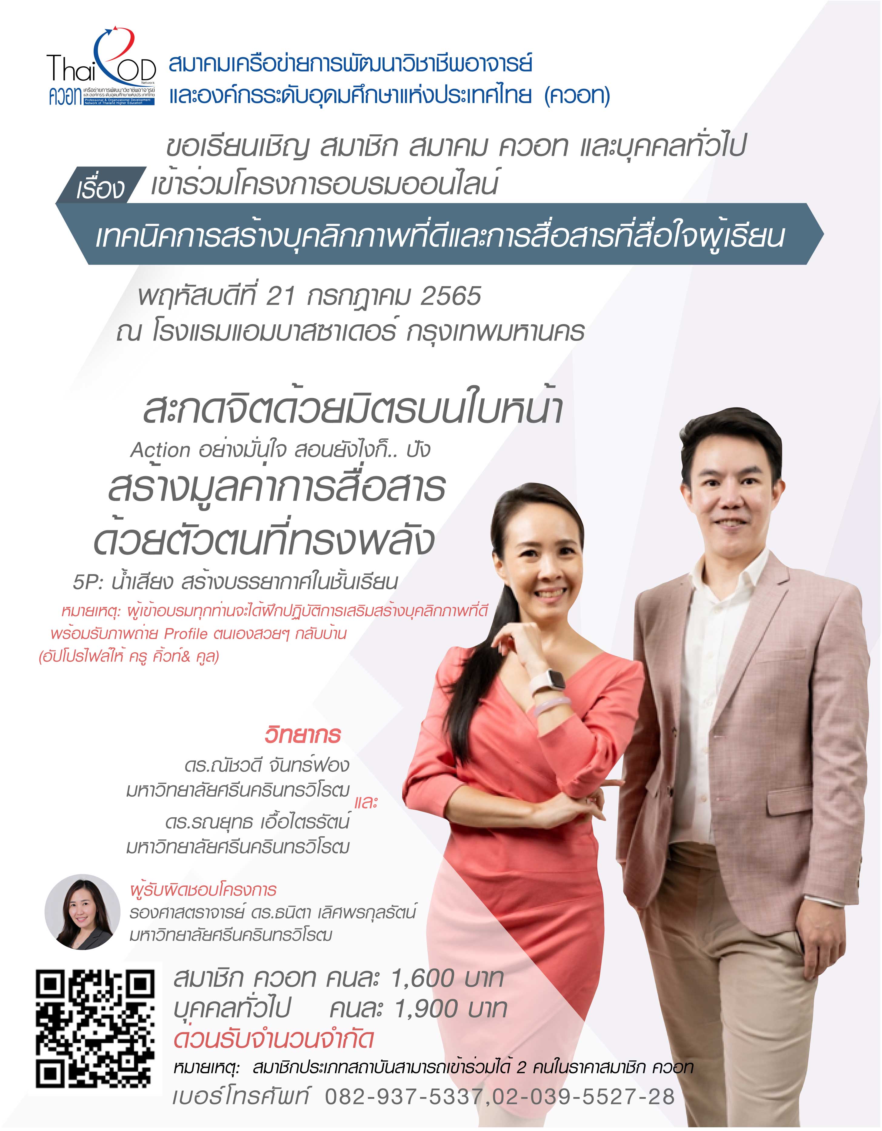 ดังนั้น เพื่อให้เกิดทักษะการสอนในระดับอุดมศึกษาที่สมบูรณ์พร้อม ทางสมาคมเครือข่ายพัฒนาวิชาชีพอาจารย์และองค์กรระดับอุดมศึกษาแห่งประเทศไทย (ควอท) จึงได้จัดโครงการอบรมเชิงปฏิบัติการ เรื่อง เทคนิคการสร้างบุคลิกภาพที่ดีและการสื่อสารที่สื่อใจผู้เรียน เพื่อสนับสนุนให้คณาจารย์ และผู้เข้าร่วมอบรมได้รับความรู้ เกิดความเข้าใจในแนวคิดทฤษฎี และร่วมฝึกปฏิบัติ เช่น การปรับบุคลิกภาพ การปรับสีหน้า แววตา การใช้จังหวะ น้ำเสียง ให้เหมาะสมกับเนื้อหาที่ต้องการสื่อสาร ตามกาละ เทศะ และตัวบุคคล ภายใต้บุคลิกภาพที่น่าเชื่อถือ และน่าสนใจ อันนำไปสู่การประยุกต์ใช้ในการจัดการเรียนการสอนในชั้นเรียน และการนำเสนองานได้ราบรื่นและมีประสิทธิภาพต่อไป