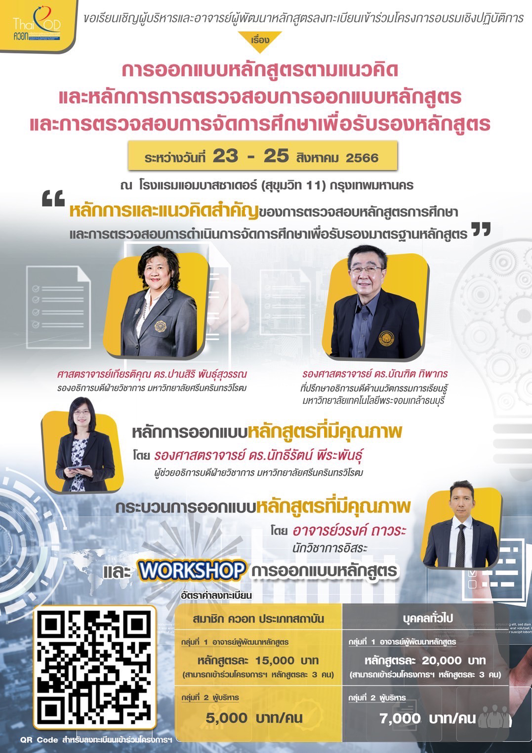 เพื่อให้อาจารย์ในสถาบันอุดมศึกษาสามารถออกแบบหลักสูตรการศึกษาที่มุ่งเน้นผลลัพธ์การเรียนรู้ ตอบสนองต่อความต้องการของผู้มีส่วนได้ส่วนเสียได้อย่างมีประสิทธิภาพ ออกแบบการจัดการศึกษาที่ประกันผลลัพธ์การเรียนรู้ ตลอดจนดำเนินการควบคุมคุณภาพการจัดการศึกษาและพัฒนาอย่างต่อเนื่อง และมีมาตรฐานตามกฏกระทรวงและประกาศที่เกี่ยวข้อง สมาคมเครือข่ายการพัฒนาวิชาชีพอาจารย์และองค์กรระดับอุดมศึกษาแห่งประเทศไทย (ควอท) จึงจัดโครงการอบรมเชิงปฏิบัติการ เรื่อง การออกแบบหลักสูตรตามแนวคิดและหลักการการตรวจสอบการออกแบบหลักสูตรและการตรวจสอบการจัดการศึกษาเพื่อรับรองหลักสูตร ขึ้น เพื่อสร้างความรู้ ความเข้าใจ และแลกเปลี่ยนเรียนรู้ระหว่างหน่วยงานและบุคลากรที่เกี่ยวข้อง ให้สามารถนำความรู้ ความเข้าใจไปประยุกต์ใช้ในออกแบบและพัฒนาหลักสูตร ตลอดจนบริหารจัดการหลักสูตรให้เป็นไปตามเกณฑ์มาตรฐานหลักสูตรและสอดคล้องกับมาตรฐานการอุดมศึกษาได้อย่างมีประสิทธิภาพและคุณภาพต่อไป