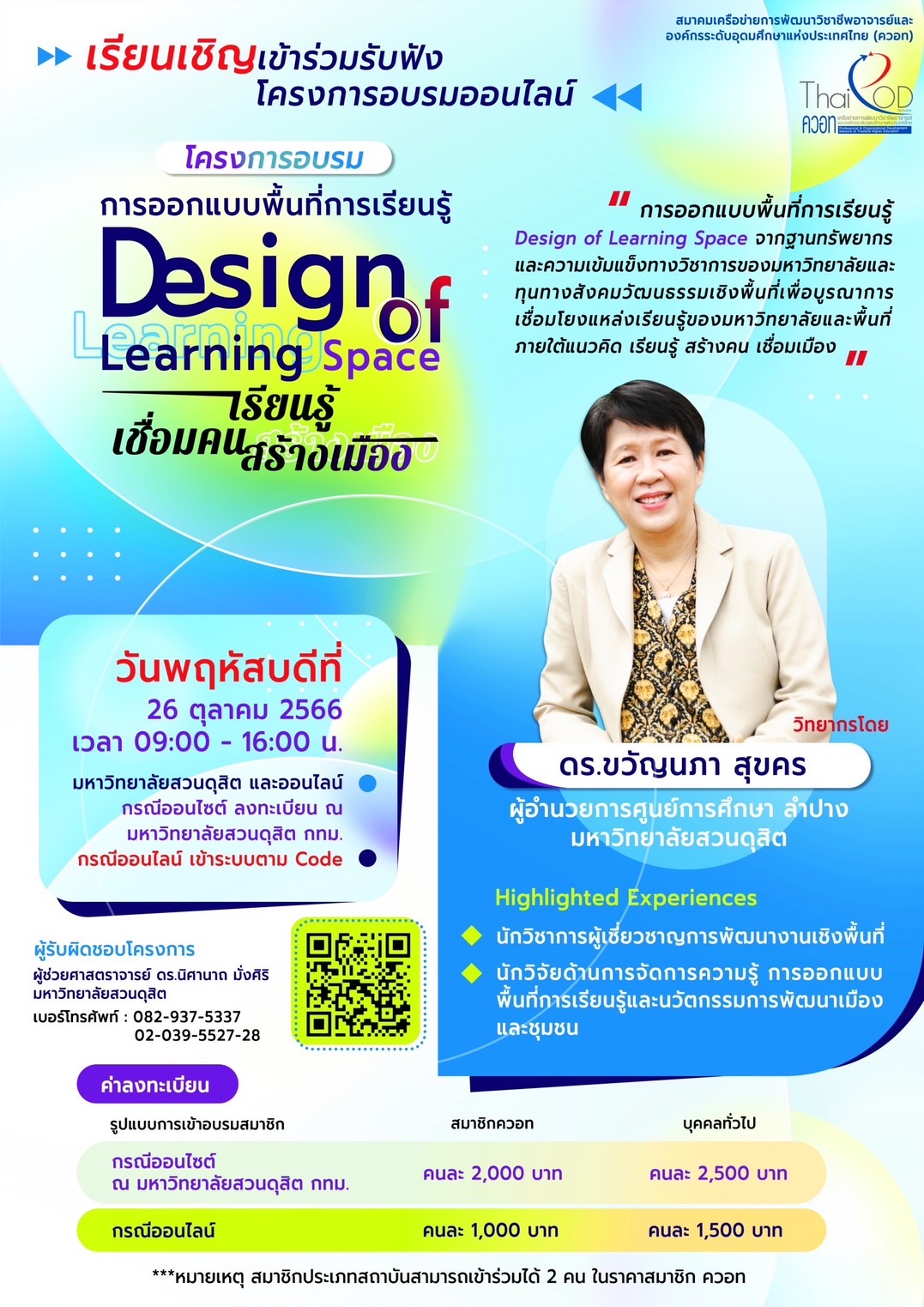 ดังนั้น สมาคมเครือข่ายการพัฒนาวิชาชีพอาจารย์และองค์กรระดับอุดมศึกษาแห่งประเทศไทย (ควอท) จึงกำหนดจัดโครงการอบรมเชิงปฏิบัติการ เรื่อง Design of Learning Space เพื่อให้ผู้เข้ารับการอบรมมีความรู้ความเข้าใจการออกแบบพื้นที่การเรียนรู้สามารถไปประยุกต์ใช้ในการพัฒนาส่งเสริมการเรียนรู้และสอนที่มีประสิทธิภาพและสร้างประสบการณ์การเรียนที่น่าสนใจสำหรับผู้เรียนและผู้สอนในยุคการศึกษาที่เปลี่ยนแปลงอย่างรวดเร็วและยังคงเปลี่ยนแปลงอยู่ในอนาคตไปข้างหน้า