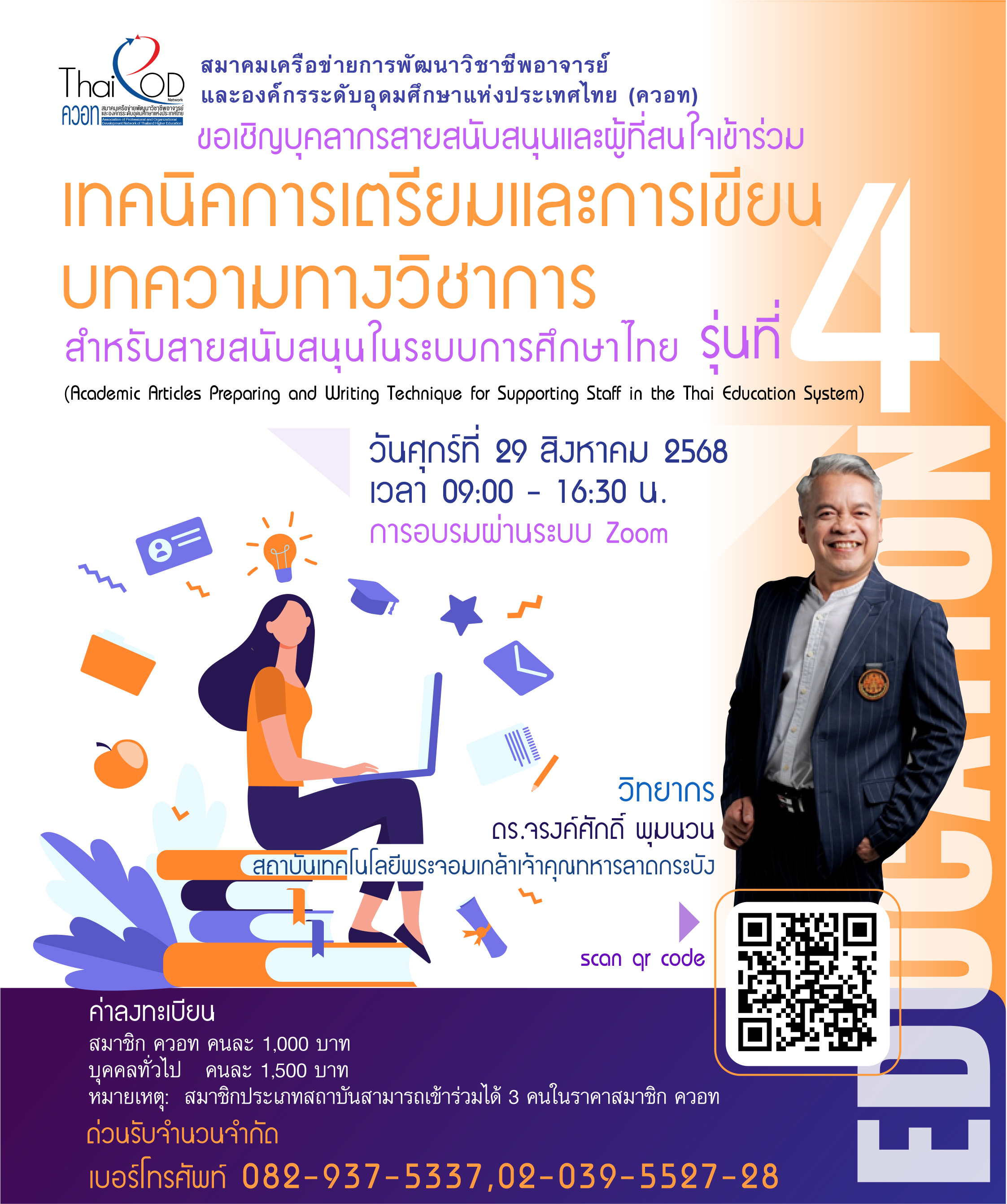 การปฏิบัติงานเป็นนวัตกรรมการให้บริการนั้น สมาคมเครือข่ายการพัฒนาวิชาชีพอาจารย์และองค์กรระดับอุดมศึกษาแห่งประเทศไทย (ควอท) จึงได้จัดโครงการอบรมออนไลน์ เรื่อง เทคนิคการเตรียมและการเขียนบทความทางวิชาการ สำหรับสายสนับสนุนในระบบการศึกษาไทย รุ่นที่ 4 (Academic Articles Preparing and Writing Technique for Supporting Staff in the Thai Education System) เพื่อให้ผู้เข้าอบรมมีความสามารถในการเตรียมและเขียนบทความทางวิชาการที่เป็นมาตรฐานตามหลักวิชาการได้